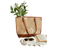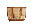 Cartera de cuero con tejido enjuncado en fibra natural y cierre magnético.